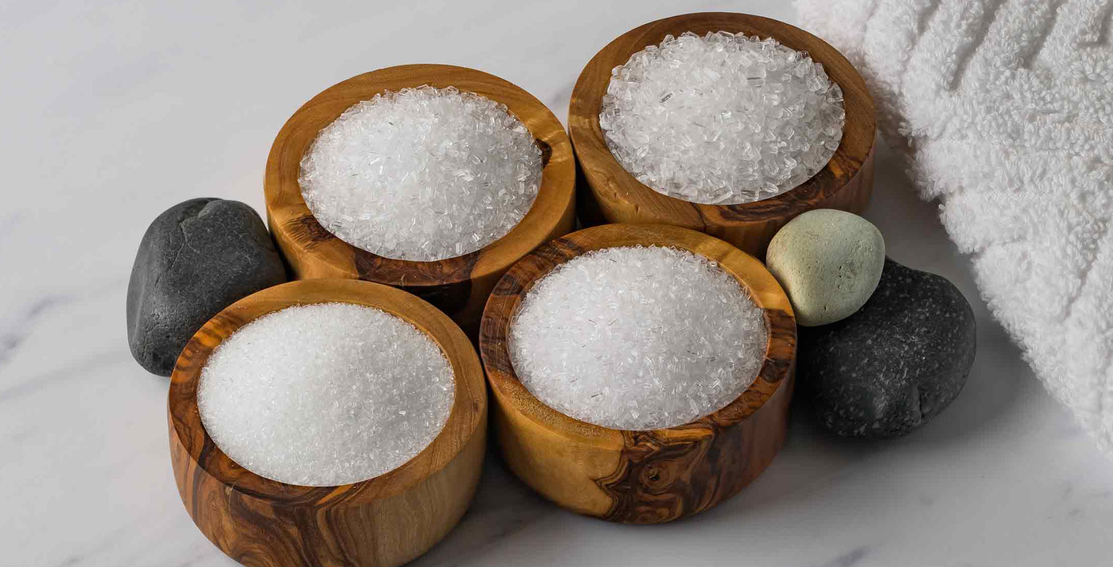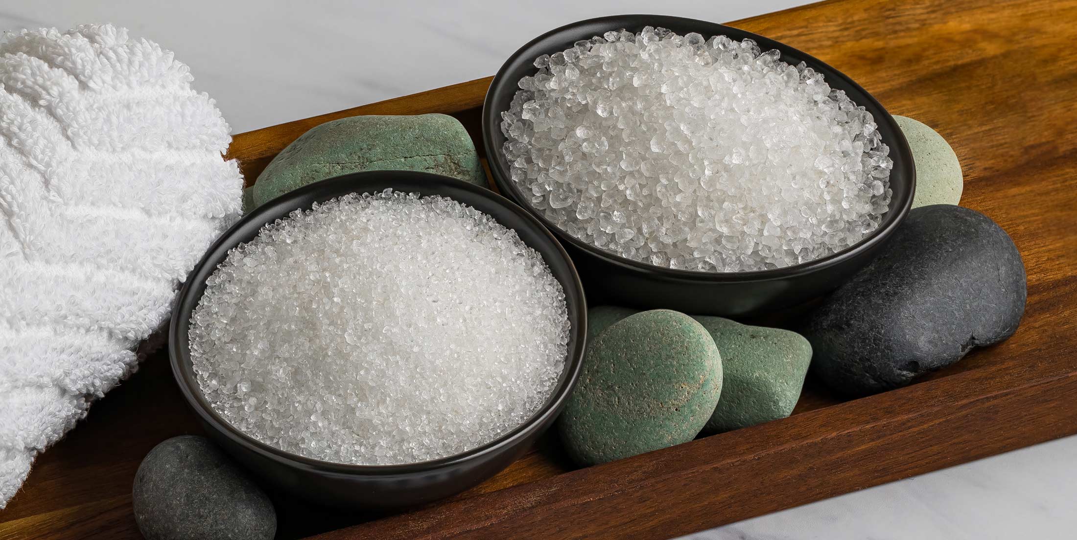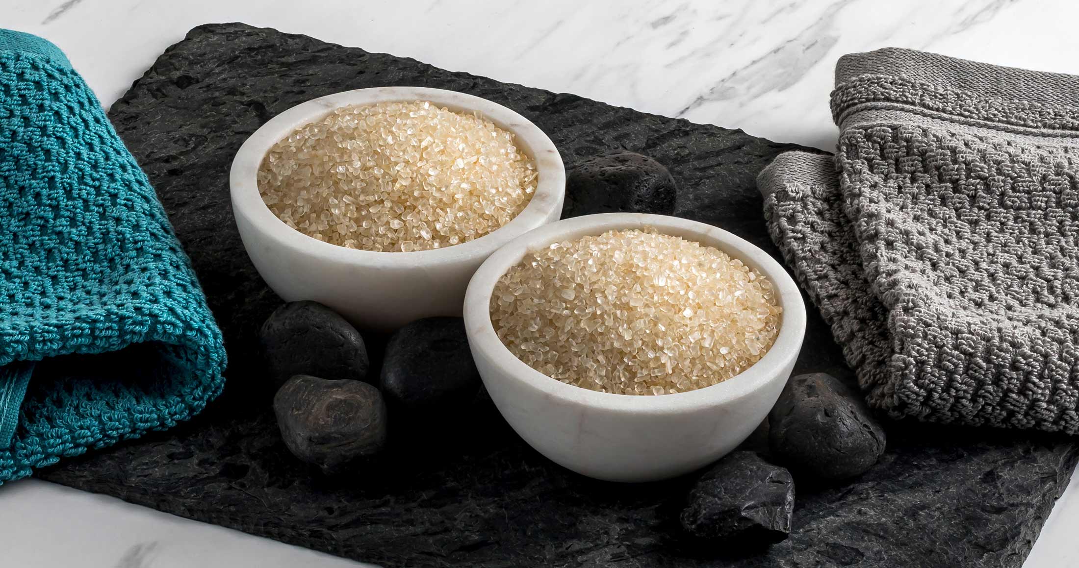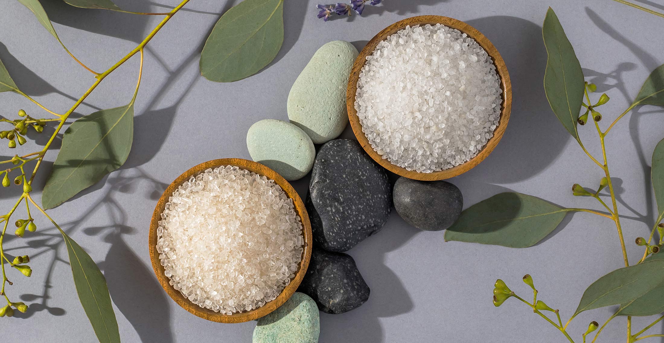 Clean, white crystal ocean salt is as exfoliating as it is soothing, and can be found in a myriad of beauty products.